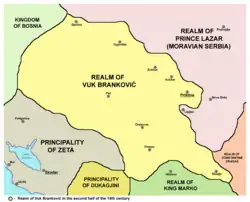 When his father died, "young king" Marko legally became a king and the co-ruler of Tsar Uroš. Soon afterwards came the end of the Nemanjić dynasty, when Uroš died on 2 or 4 December 1371, which formally made Marko the sovereign of the Serbian state. Serbian lords, however, did not even consider to recognize him as their supreme ruler,[3] and the separatism within the state increased even more.[4] After the demise of the two brothers and the destruction of their armies, the House of Mrnjavčević was left without any real power.[3] Lords surrounding Marko took the opportunity and seized significant parts of his patrimony. By 1372, Đurađ I Balšić grabbed Prizren and Peć, and Prince Lazar Hrebeljanović took Priština. By 1377 Vuk Branković acquired Skopje, and Albanian magnate Andrea Gropa became practically independent in Ohrid. The latter possibly remained a vassal to Marko as he had been to Vukašin.[4][5] Gropa's son-in-law was Marko's relative Ostoja Rajaković of the clan of Ugarčić from Travunia. He was one of the Serbian nobles from Zachlumia and Travunia (adjacent principalities in present-day Herzegovina) who had received lands in the newly conquered parts of Macedonia during Tsar Dušan's reign.[6]