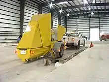 A Rolling Weight Deflectometer (RWD) is a deflectometer that can gather data at a much higher speed (as high as 55 mph) than the FWD, which allows the data to be collected without traffic control and lane closure.[8] It is a implemented as a tractor-trailer with laser measuring devices mounted on a beam under the trailer. Unlike the FWD, which pauses to make measurements, a RWD gathers deflection data while it travels.[9]