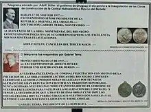 Most excellent Mr. President of the Eastern Republic of Uruguay Dr. Don Gabriel Terra. Montevideo. To the good success of the monumental work on the Río Negro, started by initiative of your government, I express to your excellency my most sincere congratulations. Adolf Hitler. Chancellor of the Reich.[20]