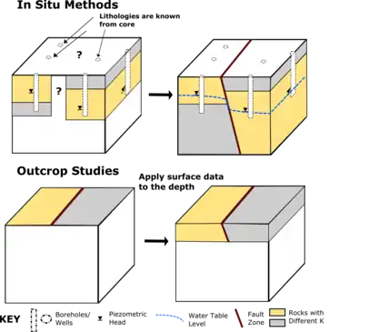 The hydraulic properties of rocks are either obtained directly from outcrop samples or shallow probe holes/ trial pits,[1] then the predictions of fault structure are made for the rocks at depth (Figure 8).
