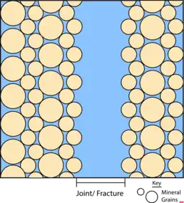 The mineral grains are broken up into smaller pieces by faulting event. Those smaller fragments will re-organise and further be compacted to form smaller pore spaces.[2] These processes create intragranular fracture pores and transgranular fracture pores.
