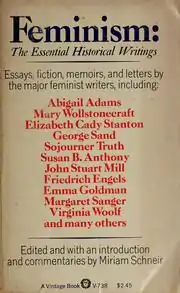 Feminism: The Essential Historical Writings is an anthology edited with an introduction and commentaries by Miriam Schneir.[1] It was originally published in 1972 and re-published in 1994 by Vintage Books.[1] It comprises essays, fiction, memoirs, and letters by what Schneir labels the major feminist writers.[1] The content included ranges from 1776 to 1929 and focuses on topics of civil rights and emancipation.[1][2] The book has had an influence on education, being used as a resource in women's studies classes.[3][4] Various scholars have given both positive and negative reviews of this book. It remains in print to this day.
