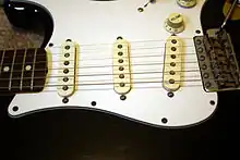 The Noiseless pickups now referred to as Vintage Noiseless[5] were original equipment on the Fender American Deluxe Series Stratocasters made between 1998 and 2003. They are now widely used on many Fender guitars made in their Ensenada, Mexico facility (so-called "Made in Mexico", or "MIM" guitars[6]) and Fender Custom Shop guitars, and have been the stock pickups on the Eric Clapton Stratocaster signature model since 2001. Vintage Noiseless pickups and are still sold by Fender. Vintage Noiseless pickups use Alnico II magnets.[7] These pickups were the result of three years of research aimed at combining the advantages of single coils with those of humbuckers: the characteristic sound of the former and the silence of the latter. Fender's intent was to develop a pickup that could evoke the vintage Stratocaster sound and the silence of Lace Sensor pickups.[8] The Stratocaster version is identified by the word "Noiseless" in gold cursive on the aged white or black pickup covers and the use of staggered pole pieces.[9] The Stratocaster set of Vintage Noiseless pickups comes packaged with two 1MΩ potentiometers ("pots") and a .022µF capacitor for tone controls,[10] one 500kΩ pot for volume control, a 680pF capacitor and a 220kΩ resistor for a treble bleed circuit,[11] and a wiring diagram.[12] Vintage Noiseless pickup sets are also available for the Telecaster and Jazz Bass. Features include: