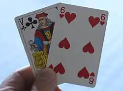 The farmer deals one card to each opponent from the top of the pack and then another from the bottom. Players may then call for more cards, one by one, to try to get closer to 16.[lower-alpha 2] If a player's hand cards exceed 16, that player pays the farmer one jeton for every excess point. If no-one scores 16, the player who is nearest 16 without exceeding it, wins the pool, but not the farm. Players on 12 to 15 points may 'stick' to avoid exceeding 16 and having to pay the farmer. A player scoring exactly 16, wins the farm and contents of the pool, 'deposing' the current farmer and taking over as farmer for the next round.[1]