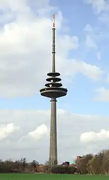 The Fernmeldeturm Münster (Telecommunication Tower Münster) or, colloquial: "Fernsehturm" (TV-Tower) is the modern landmark of Münster completed in 1985/86. The 229.5-metre-high (753 ft) tower, which is used for directional services and TV-, VHF- and UHF-transmission is not accessible to the public. The basket of this tower, which carries also the name "Münster 42" has a diameter of 40 metres and is situated at a height of 108 metres.