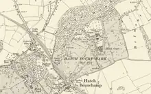1886 Ordnance Survey map showing Hatch Court, the deer park and the ancient parish church of St John the Baptist (to the immediate north of the house). Before 1886 the park was bisected by the Great Western Railway Taunton to Chard branch, closed and dismantled in 1964 during the Beeching cuts. Also in the mid-20th c. bisected by the A358 road, since rebuilt one kilometer westwards, now connecting the A303 trunk road and the M5 motorway
