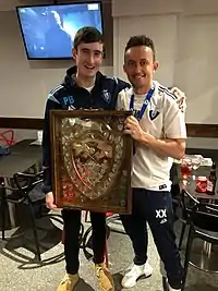 Fiachra (right) and teammate Padraig Biggane after winning the 2018–19 Kent Intermediate Challenge Shield with South East Athletic