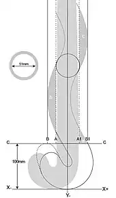 The sample illustrated does not reach the line A1A1 on the 'heel edge' and the Y axis is not central to the shaft, which raises the question "How is the stick positioned for measurement of permitted deviation." The answer is that the vertical axis Y runs through the top centre of the handle and the stick is assumed to be suspended from that top centre point and perpendicular to the X axis (the ground), the curve to the base of the head of the stick being in contact with the ground, it is therefore not necessary for the Y axis to pass through the centre of the shaft just above the head of the stick, although in most traditional sticks it will do so (or very nearly do so—as 'rake' to the handle may cause the Y axis to run a few millimeters to the heel side of the true centre of the shaft). To October 2015 no official measuring method or device for measuring 'permitted deviation' has been approved by the FIH.