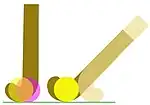 Using extreme examples is useful as a means of demonstrating effects that occur in less extreme configurations but are much more difficult to spot and therefore to explain. The first observation is an easy one (top left in the image captioned "Reversed head in various…"). If the stick head is rotated onto the reverse (lighter colour) the toe is not going to disappear into the ground to enable the reverse side of the stick to be presented to the ball—a vertical adjustment is necessary. Secondly (top right), if the handle of the stick is kept at exactly the same angle and rotated, a horizontal adjustment is necessary to bring the reversed head to a position where contact will be made with the ball. The third figure (bottom left) shows these adjustments having been made (and a change to the angle of the handle because the position of the hand holding the stick at the top would be about the same as it is when gripping the stick in the forehand position), but the area of stick head making contact with the ball is very small; so control may not be adequate. The fourth figure (bottom right) demonstrates that to get good contact with the ball on a larger area of the reversed head, it is necessary to move the handle much nearer to the vertical. This means the player must bring the ball in very close to the feet and come to a more upright dribbling position—this in turn impairs the ability to scan the pitch and keep the ball in peripheral vision at the same time—a considerable disadvantage when dribbling to evade opponents.