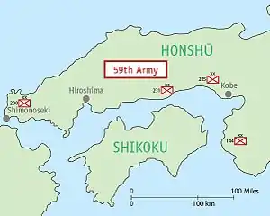 The Japanese 59th Army was formed on June 15, 1945, under the Japanese 15th Area Army as part of the last desperate defense effort by the Empire of Japan to deter possible landings of Allied forces in the San'yo region of western Honshū during Operation Downfall. The Japanese 59th Army consisted mostly of poorly trained reservists, conscripted students and home guard militia. Headquartered in Hiroshima, most of its command staff, including its commander Lieutenant General Yoji Fujii, were killed during the atomic bombing of Hiroshima. Together with the 2nd General Army, Fifth Division, and other combat divisions in the city who were also hit, an estimated 20,000 Japanese combatants were killed. Remnants of the 59th Army attempted to perform relief work and maintain public order in the devastated city with little success. The IJA 59th Army was officially demobilized after the surrender of Japan on August 15, 1945.