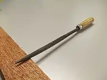 A file is a tool used to remove fine amounts of material from a workpiece. It is common in woodworking, metalworking, and other similar trade and hobby tasks. Most are hand tools, made of a case hardened steel bar of rectangular, square, triangular, or round cross-section, with one or more surfaces cut with sharp, generally parallel teeth. A narrow, pointed tang is common at one end, to which a handle may be fitted.[1]