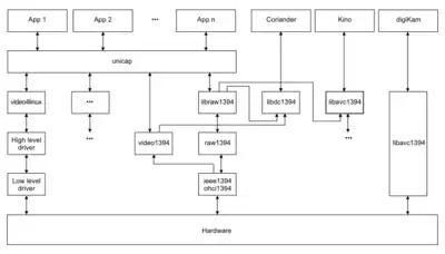 - Video cameras are accessed by various APIs. The image to the right depicts the access of the video editing software Kino to the libavc1394 API. Kino also accesses other APIs which are not shown in the image to simplify matters.