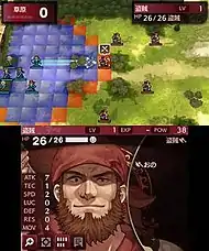As with other Fire Emblem games, Fire Emblem Echoes uses a turn-based system where each unit on both sides is given their chance to move and act. Battles take place on a grid-based battlefield, with turns being given for players and enemies. During an attack, the view transitions from a top-down perspective to a third-person view.[5] Unlike many other Fire Emblem games, the Weapon Triangle (a rock–paper–scissors system where certain weapons have advantages over others) and limited weapon durability are removed. Units instead have standard weapons that last the whole campaign, and they can be given special weapons which replace their standard weapon and grant passive advantages. Each unit can only carry one weapon, which can unlock special Combat Arts as its wielder gains experience points and levels up through battle.[6][8] Combat Arts are weapon-specific special moves that can range from higher-damaging attacks to supportive abilities like swapping places with another unit. Each unit is assigned a unique character class, with the class dictating their weapon and consequently their actions; archers can attack at a distance, melee fighters are limited to close-range attacks, while mages must sacrifice a portion of their health to perform an action. Once a unit has reached a certain level, their class can be evolved into more powerful versions. Villager NPCs can also be recruited in towns; while initially weak, they can be strengthened and assigned any available character class.[7][8]