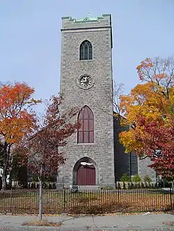 The First Church of Jamaica Plain is a historic church at 6 Eliot Street in the Jamaica Plain neighborhood of Boston, Massachusetts. The stone Gothic Revival church was designed in 1854 by the well known Boston architect, Nathaniel J. Bradlee, for a congregation which was established in 1769 as the Third Church of Roxbury.[2] It is built out of ashlar granite, laid in courses without ornament. It has a square tower with Gothic arched windows at the second level, a clock face at the third, and Gothic louvered openings at the belfry, and a parapeted top. A Shingle style parish hall was added in 1889.[3] This new addition was designed by Cabot, Everett & Mead.[4]