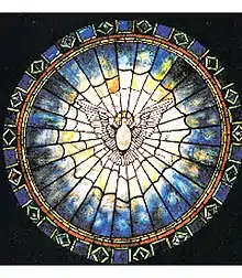 The only Tiffany window which was not commissioned by a family, but was done by the congregation for the congregation. Also, when the Brombaugh pipe organ was installed, the organ pipes were designed to fit around the Window. Tiffany craftsmen achieved a technically and structurally difficult effect in designing the Dove Window's circular pattern. They created visual depth by using up to three layers of glass in some places and the border sparkles with sapphire and emerald colored Tiffany jewel-like glass.