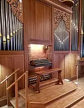 In consultation with organist Dr. Rudy Zuiderveld and builder, John Brombaugh, the church approved an organ of three manual keyboards and pedalboard, with 46 stops and 3,240 pipes. The resulting organ is 30 feet long, 29 feet high and slightly less than a yard deep, with a smaller division of pipes, known as the "ruckpositive" located behind the organist on the front of the balcony. Brombaugh based the architecture of the organ case and its ornamentation on a late Renaissance style that was adapted to fit the First Presbyterian Church. One requirement was that the round Tiffany "Dove" stained glass window remain visible.[10] The organ's surrounding facade is made of unfinished and oiled Appalachian white oak, with the mouths of all facade pipes gilded with 23-carat gold leaf.
