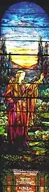 The newest, and final of the Tiffany windows, this window dates from 1925, and was done at the time by the Tiffany studios when they were at their height. The artists at Tiffany didn't like the way that the flesh colored tones of the stained glass looked in windows so they painted the faces instead of using stained-glass. The window is dedicated to Stuart Brown and his wife, Kay Hay Brown, and given by their children. Mr. Brown was a prominent lawyer in Springfield. His grandfather, Stuart T. Brown, was a mentor of Abraham Lincoln.[7]