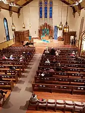 The exterior of the church sanctuary, dating from 1868, has changed little except for the removal of the original tall spires, but it is now buttressed by a steel superstructure. The interior, however, has been remodeled several times, with the most extensive changes being made in the early 1940s. Originally, it featured a center-raised pulpit on a stage-like platform and two side aisles dividing the nave into three sections, rather than the present central aisle dividing the nave in two. Exposed organ pipes were a focal point of the chancel area. The original building interior, with its rounded arches and central focus, contained elements of the Romanesque style. The original sanctuary windows were the same size and in the same places as the present memorial windows, while the current chancel windows replaced the organ pipes during the 1940s renovation. An addition was put onto the west side of the building in 1928. A chapel, north of the sanctuary, was added in 1945.