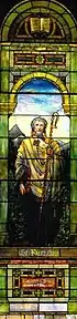 Created by the Pittsburgh Stained Glass Studios, under the direction of Howard G. Wilbert, the window serves as a memorial to Nancy Jane Mackie by her parents. Nancy died at age 26 and the design of the window depicts St. Elizabeth of Hungary who died at the age of 24. The window was dedicated in 1938. Sadly, Nancy's father, A.D. Mackie died less than a month after the dedication.[8] Mr. Mackie was the president of Central Illinois Light Company (CILCO).