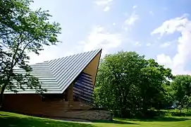 The society is housed in the historic Unitarian Meeting House, which was designed by Frank Lloyd Wright, one of its members and the son of two of its founders.[6] Wright was commissioned to design the Meeting House in 1946.[7] The dramatic result has been variously interpreted as the prow of a ship, a plow cutting through the prairie, and hands folded in prayer.
