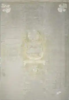 OBVERSE: Azure the Blessed Virgin Mary Argent vested Gules cloaked Azure crowned and enhaloed of mullets, holding the Christ child and standing on a crescent above a scroll Argent inscribed REFUGIUM PECCATORUM [Refuge of Sinners] in letters Sable ensigning the arms of Beauharnois (Argent a fess and in chief three martlets Sable) ensigned by a marquis’s coronet, suspended therefrom the insignia of the Ordre de Saint-Louis and supported by two eagles close, all between four fleurs-de-lis reversed, two in bend and two in bend sinister Argent; REVERSE: Azure the arms of France Modern (Azure three fleurs-de-lis Or) ensigned by the Royal Crown of France and environed by two palm branches Or bound by a ribbon Gules all between four fleurs-de-lis reversed, two in bend and two in bend sinister Argent;[3]