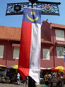 The Flag of Malacca is the flag of the Malaysian state of Malacca. Red, white, yellow and blue, which are the colours of the flag of Malaysia, are also used in the flag of Malacca to emphasize that Malacca is a member state of Malaysia. The star and crescent represents Islam, the official religion of the State and of the nation. The top left hand quarter has a background of royal blue with a yellow crescent moon and a yellow five-pointed star. The top right hand quarter is red and the lower half is white.[1]