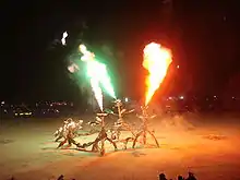 Flaming Lotus Girls is a volunteer-based group of artists who make large-scale kinetic fire art. FLG has been described as a "women-focused anarchist art collective."[1] The group began in 2000, in San Francisco, California, as a group of six women and two men who wanted to gain the fabrication skills and design experience needed to create large sculptural installations.[2] The group includes over a hundred members of all genders, and a majority of the members are women.[3] Many of the sculptures have interactive elements, allowing the audience to control the lighting, flames, sound, or other effects.[4] The collective's work has appeared throughout the United States, as well as in Canada, Australia, and the Netherlands.[5]