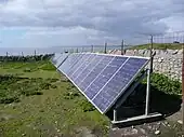 In 2007 the system was extended to include a 27 kWh battery bank charged by two photovoltaic solar arrays of 3 and 5 kW, and by a 6 kW wind turbine sited at a redundant telecommunications tower on the high point of the island.[59]