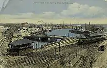 The first terminus had a single platform 30 metres (98 ft 5 in) long, and was located beside the Fish Market building on the south-west corner of Swanston and Flinders Streets.[14] An additional platform was provided in 1877, along with two overhead bridges to provide passenger access, followed by additional timber and corrugated iron buildings and a telegraph station in 1879.[11] The first signal boxes were opened at the station in 1883, one at each end of the platforms.[15] By the 1890s, a third island platform had been constructed.[15]