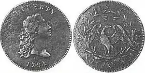 The Flowing Hair dollar was the first dollar coin issued by the United States federal government. The coin was minted in 1794 and 1795; its size and weight were based on the Spanish dollar, which was popular in trade throughout the Americas.