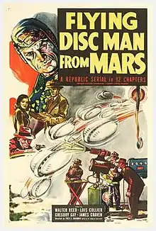 Flying Disc Man from Mars is a 1950 Republic Pictures 12-chapter black-and-white science fiction adventure film serial, produced by Franklin Adreon, directed by Fred C. Brannon, that stars Walter Reed, Lois Collier, Gregory Gaye, James Craven, Harry Lauter, and Richard Irving. Disc Man is considered a weak example of the serial medium, even compared to other post-World War II serials.[2] In 1958 Republic edited the serial's 167 minutes of footage into a 75-minute feature, released under the new title Missile Monsters.[1]