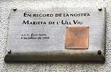 It is popularly known as the real Font del Gat or as Font de la Marieta de l'Ull Viu (the one from the song Baixant de la Font del Gat), given that the Font del Gat from Montjuich dates from 1928 and could not be that of the popular song which existed before. The name Marieta de l'ull viu is given as a memory of Marieta who, according to the tradition of the neighborhood, was born in Carrer Portal Nou, without ever leaving the district and that the lyrics "descending from the font del gat, a girl and a soldier" would have to say "passing by the fountain of the gat..." because near the square there was (until a few years ago, converted into a recruit box) the military barracks built on the Convent of Sant Agustí, demolished by order of Philip V, for having been a center of strong resistance in the Barri de Ribera in 1714.[9]