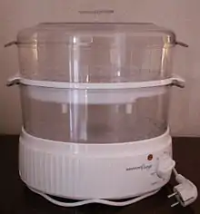 A food steamer or steam cooker is a small kitchen appliance used to cook or prepare various foods with steam heat by means of holding the food in a closed vessel reducing steam escape. This manner of cooking is called steaming.