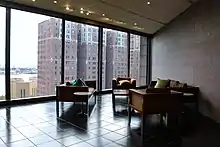 According to blueprints, the elevators and one set of emergency stairs are on the western side of the building, near the northwest corner. Another set of emergency stairs are on the northeast corner. There are also emergency stairs within the diagonal piers on the eastern and southern sides of the building, at the ends of the northern and western wings respectively.[18][37] In addition, there is an auditorium and conference room in the basement.[50] This auditorium contains a tapestry by Sheila Hicks.[51][39] There are 54,000 square feet (5,000 m2) of event space that can be rented for events, as well as an art gallery and office space that can be rented to other organizations.[39]