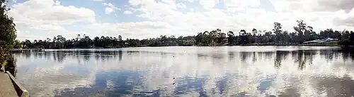 The centrepiece of Forest Lake is an $8.9 million, 10.9 hectare man-made recreational lake, with a perimeter of 2.7 kilometres (1.7 mi). $1.8 million was spent on the dam wall, outlet structure and boulevard embankment. It has an average depth of 2.6 metres with a 300 to 600 mm around the safety ledge, deepening to 4 metres in the centre. The volume of the lake is 310,000 cubic metres or 269 Olympic sized swimming pools. Surrounding the lake is 3.5 kilometres of pedestrian and cycleways and 8 hectares of adjacent parkland. It was completed and opened in 1994.[3]
