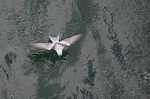 Like other storm petrels, the fork-tailed storm petrel mainly feeds on crustaceans and fish near the surface of the ocean, including amphipods, myctophids, shallow-water fish (such as greenling and sablefish), copepods, decapods, and squid.[18] They are also extremely opportunistic and can be seen scavenging on fatty tissue of dead marine mammals[19] and also trailing behind fishing boats.[2]
