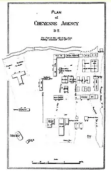 Cheyenne River Agency was established in 1869, following conclusion of the Fort Laramie Treaty, as agency for the Two Kettle, Sans Arc and Miniconjou Sioux. On May 17, 1870, Companies B and C of the 17th U.S. Infantry, under command of Captain Edward P. Pearson, officially established the "Post at Cheyenne River Agency."[1] It was built next to the agency 7 miles above Fort Sully to afford military protection.[2]