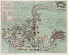During the War of the Austrian Succession (1740-1748) the locks and Dam of Crèvecoeur were put into action after Flanders was lost to the French in 1746. That same year the locks in the Dieze that flowed through the fort were completed,[18] and shipping was led through the fortress till the Treaty of Aix-la-Chapelle (1748). At first ships could not use the canal through the fort because of strong currents.[21] This was solved later on.[22] From a military perspective the measures were quite effective. Surrounded by water on all sides 's-Hertogenbosch 'resembled an island'.[23]