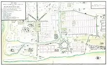 The fort was bordered by a moat and served as the citadel with native and European housing in gridded layout nearby. The muslim quarter to the southwest of the fort had diagonal roads. The fort was destroyed by the British in 1761. The site of French Fort Louis was very close to the Government Park (also known as Bharati Park) which is now surrounded by government buildings including the governor's office. The areas of the town were called Ville Blanche (white town) and Ville Noir (black town for the natives).[3]