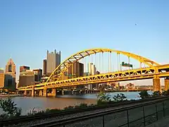 The Fort Pitt Bridge is a steel, double-decked bowstring arch bridge that spans the Monongahela River near its confluence with the Allegheny River in Pittsburgh, Pennsylvania. It carries Interstate 376 between the Fort Pitt Tunnel and Downtown Pittsburgh. Opened in June 1959 as a replacement for the Point Bridge, the Fort Pitt Bridge was the world's first computer-designed bowstring arch bridge[1]: 00:02:43 and double-decked bowstring arch bridge.[2] The bridge is known for its difficult lane changes, especially on the lower level, often requiring people to go from the extreme left lane across two lanes to the extreme right lane in only 700 feet.[3] The upper level is more forgiving for some routes but still requires a full span lane change in 700 feet to get from the south side entrance to the downtown exits.