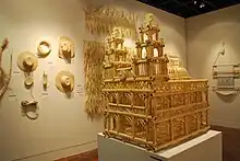 Moreno Reinoso makes large, ornate bird cages from the reeds and bamboo often in the forms of churches and houses, as well as boxes for paper, laundry baskets, book shelves and other light furniture.[1]