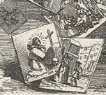 A trail of peculiar footprints shows the path trodden by the woman on her pattens to avoid putting her good shoes in the snow and filth of the street.[14] A small object hangs at her side, interpreted variously as a nutcracker or a pair of scissors in the form of a skeleton or a miniature portrait, hinting, perhaps, at a romantic disappointment. Although clearly a portrait in the painting, the object is indistinct in the prints from the engraving. Other parts of the scene are clearer in the print, however: in the background, a quack is selling his cureall medicine, and while in the painting the advertising board is little more than a transparent outline, in the print, Dr. Rock's name can be discerned inscribed on the board below the royal crest which suggests his medicine is produced by royal appointment. The salesman may be Rock himself.[15] Hogarth's opinion of Rock is made clear in the penultimate plate of A Harlot's Progress where he is seen arguing over treatments with Dr Misaubin while Moll Hackabout dies unattended in the corner.