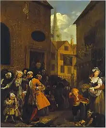 The scene takes place in Hog Lane, part of the slum district of St Giles with the church of St Giles in the Fields in the background. Hogarth would feature St Giles again as the background of Gin Lane and First Stage of Cruelty. The picture shows Huguenots leaving the French Church in what is now Soho (or perhaps the Huguenot Chapel on West Street, St Giles).[17] The Huguenot refugees had arrived in the 1680s and established themselves as tradesmen and artisans, particularly in the silk trade; and the French Church was their first place of worship. Hogarth contrasts their fussiness and high fashion with the slovenliness of the group on the other side of the road; the rotting corpse of a cat that has been stoned to death lying in the gutter that divides the street is the only thing the two sides have in common.[c] The older members of the congregation wear traditional dress, while the younger members wear the fashions of the day. The children are dressed up as adults: the boy in the foreground struts around in his finery while the boy with his back to the viewer has his hair in a net, bagged up in the "French" style.[18]