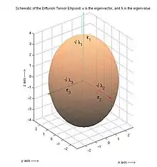 A Diffusion Ellipsoid is completely represented by the Diffusion Tensor, D. FA is calculated from the eigenvalues () of the diffusion tensor.[1] The eigenvectors give the directions in which the ellipsoid has major axes, and the corresponding eigenvalues give the magnitude of the peak in that direction.