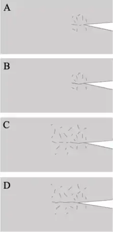 • Stage I: As the sample is loaded, the frontal process zone forms which is a zone of micro cracks ahead of the main crack tip. The crack accelerates through this zone until the crack tip is ahead of the formed microcracks. Crack propagation slows when the crack tip is ahead of the microcrack zone, where the region of microcracks exert a compressive stress on the crack tip.[4]