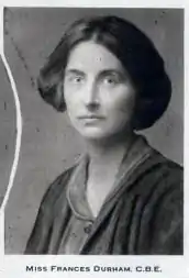 Frances Hermia Durham CBE (14 August 1873 – 18 August 1948) was a noted British civil servant, the first woman to reach the rank of assistant secretary, who was largely responsible for organisation of women's services in the army, munitions and agriculture during World War I, for which she was appointed a CBE.[1][2]
