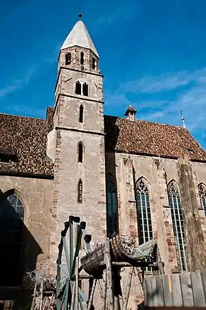 The Gothic church itself comprises a three-aisled nave and a choir section with a polygonal plan, under a ribbed arched roof, all primarily constructed out of pink sandstone. The apse is dominated by three large windows of modern stained glass, which are the work of the Innsbruck artist, Josef Widmoser. The middle window shows the Stigmata appearing on Saint Francis, to whom the church is dedicated. The window on the left shows three scenes: the lowest is of the saint returning his rich clothes and his money to his father: the middle scene shows Saint Francis appearing before the Pope in order to obtain authorization for the creation of his order, and the scene at the top shows King Louis IX of France, sometimes known as Saint Louis, with Elizabeth of Hungary, another royal princess venerated as a saint. The window on the right is also divided into three scenes devoted to Francis of Assisi: at the top he is shown between Christ and His Mother: the middle scene shows the saint preaching to the birds, which is a particularly well-known aspect of his ministry; and the lower scene shows his death.