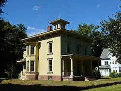 The Franklin Johnson House is located in a residential area south of Wallingford's central business district on the west side of South Main Street south of Prince Street. It is a 2+1⁄2-story masonry structure, built out of brick that has been finished with stucco-like concrete scored to resemble stone. It is covered by a low-pitch hip roof, at whose center is a square cupola. The roof eaves are decorated with large carved brackets, and the cupola, a reproduction of the building's original one (lost in the New England hurricane of 1938) also exhibits Italianate features. The main facade is three bays wide, and its first floor is sheltered by a porch with tapered and fluted round columns separated by iron balustrades. Windows are set in rectangular openings that have pink granite lintels and sills. To the rear of the property there is a multi-seat outhouse, built with stylistically similar materials.[2]