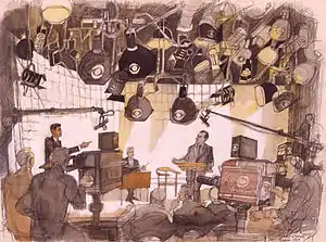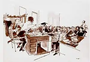 Franklin McMahon's on-the-spot drawings were generally done with a charcoal pencil, then colored in his home studio afterwards, using acrylic watercolors.[37]