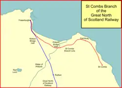At a shareholders' general meeting early in 1898 Lord Saltoun argued against the St. Combs railway, believing that the fisherfolk should gravitate from their villages to the towns, and saying the line was "virtually doing mischief", but the meeting gave the plan its approval. The St Combs Light Railway Order was confirmed on 8 September 1899, authorising construction of the line. Five years were given for completion of the 4 miles 514 yards.[5][3][6]